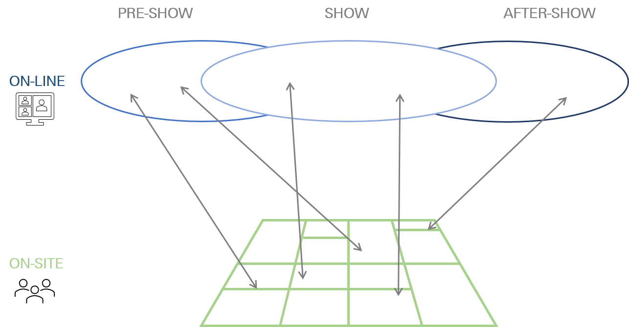 Gerade der neuartige digitale Bereich der Messen ist vielfältig und entwickelt sich stetig weiter. Bei einer hybriden Messe kann der digitale Bereich im Vorfeld genutzt werden, um Besuchende und Ausstellende auf die Messe einzustimmen, sie anzuteasern und einen Ausblick zu liefern. Während der Messe wird über eine Plattform kommuniziert. Es werden Live-Vorträge gestreamt und es findet ein Austausch unter den Teilnehmenden statt. Diese können jeweils Online oder Onsite partizipieren. Im Nachgang wird ausgewähltes Material den Teilnehmenden zur Verfügung gestellt. Hierbei handelt es sich lediglich um einen Ausschnitt der weitreichenden Möglichkeiten.