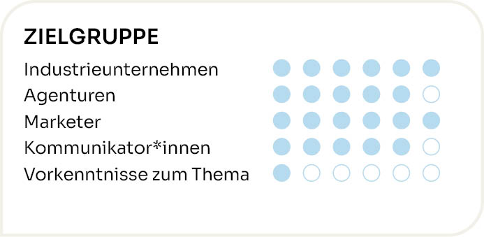 Unser gemeinsames Ziel: Marketing und Kommunikation vom Kostenfaktor zum Umsatztreiber transformieren! Anhand Ihrer individuellen Unternehmenssituationen erarbeiten wir die ersten konkreten Schritte, tauschen uns aus und lernen voneinander. Im Rahmen des Kurses erstellen Sie Ihre eigene MarCom-Prozess-Bibliothek, definieren oder passen Positionsbeschreibungen an und setzen die ersten messbaren, transparenten und kommunizierbaren Leistungs- und Ergebnisindikatoren für Ihr B2B-Marketing und -kommunikation fest.