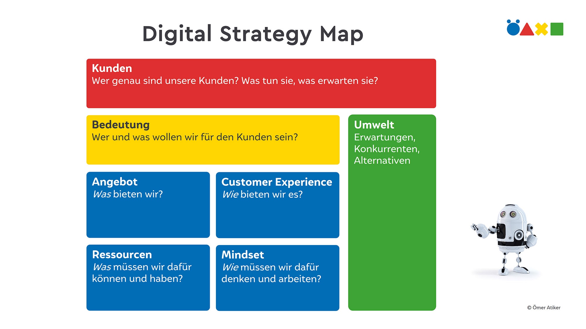 Der nächste Schritt ist es, das eigene Geschäftsmodell zu verstehen. Dabei hilft die Digital Strategy Map. Ausgehend vom Kunden sehen wir, welche Rolle das eigene Unternehmen für den Kunden spielt (Bedeutung) und was wir dafür brauchen – nicht nur die Produkte und Services, sondern auch die richtige Customer Experience.