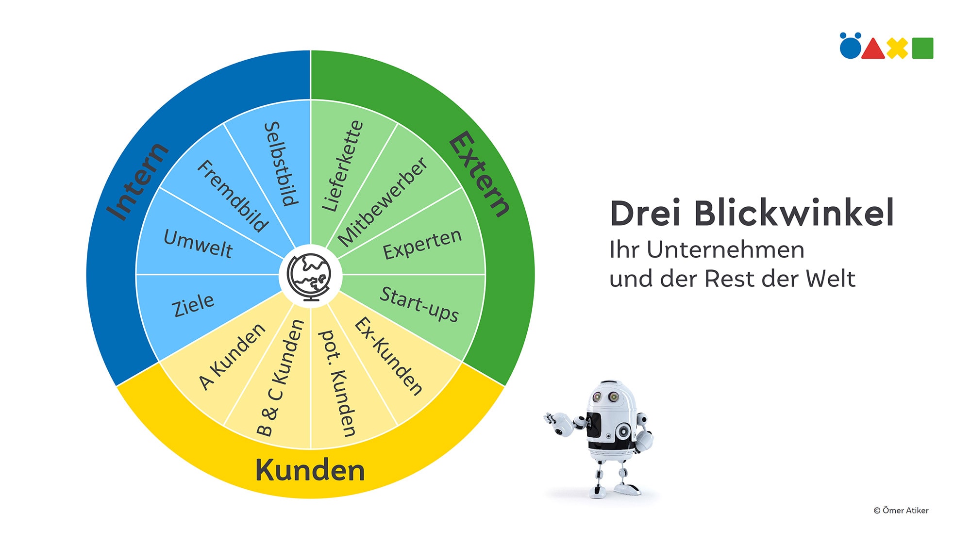 Das Denkmodel der drei Blickwinkel zeigt uns drei große Perspektiven: Das Selbstbild, den Eindruck der Kunden und die Einschätzung von Dritten. Dieses Modell hilft, die eigene Position weit besser zu verstehen.