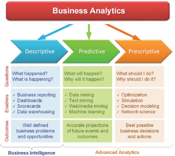 Business Intelligence oder kurz „BI“ genannt, fokussiert sich grundsätzlich auf Ereignisse, welche bereits in der Vergangenheit passiert sind, sowie deren Auswirkung auf die Gegenwart. Eine klassische Fragestellung in diesem Bereich wäre zum Beispiel „Wie hoch war der Umsatz von Produkt XY jeweils im ersten Quartal der letzten drei Jahre in Region Z?“. BI umfasst allgemein sämtliche unternehmensinternen Informationssysteme und Technologien zur Unterstützung der Entscheidungsfindung sowie Kontrolle operativer Abläufe. Predictive Intelligence erweitert die klassische „Rückspiegel-Perspektive“ des BI um einen Blick auf das aktuelle Geschehen und potenzielle Auswirkungen auf die Zukunft. Data Mining bildet dabei jenen Teilbereich des Predictive Intelligence, der durch statistische Methodologien wie lineare und logistische Regressionen Wahrscheinlichkeiten für zukünftige Ereignisse (z.B. Absprung eines bestehenden Kunden, Ausfall einer Produktionsmaschine) berechnet. Es wird oft als der automatisierte Prozess zur Entdeckung unbekannter Muster in den strukturierten sowie unstrukturierten Daten eines Unternehmens bezeichnet, wobei manche Definitionen auch sämtliche Teilprozesse von der Sammlung und Filterung über die Bereinigung, Analyse bis hin zur Speicherung von Daten als Data Mining miteinbeziehen. Prescriptive Analytics zu guter Letzt erweitert zuvor genannte Methoden um das „Wie“ und versucht somit eine kausale Erklärung über zukünftige Ereignisse sowie Handlungsempfehlungen zu geben. Alle genannten Bereiche fallen unter den Schirm des „Business Analytics“, wie schematisch in der nebenstehenden Grafik dargestellt.