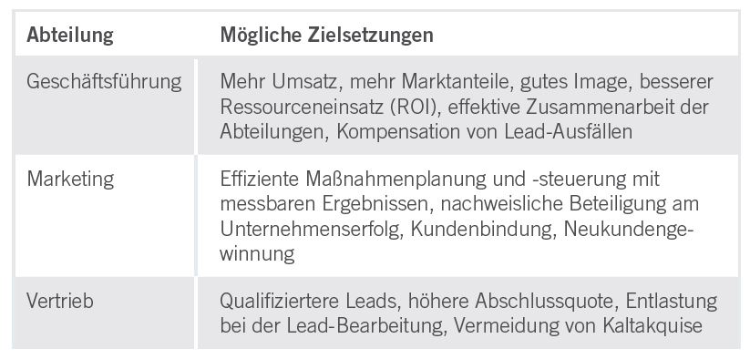 Aber um das Thema Marketing Automation, etwa in Verbindung mit Lead Management, in einem B2B-Unternehmen zu etablieren, bedarf es einer sorgfältigen internen Kommunikation. In der Regel ist zwar das Marketing der Treiber dieser Veränderung, sollte sich jedoch zuvor der Unterstützung des Managements oder der Geschäftsführung versichern. Im ersten Schritt gilt es, jede Abteilung und jeden Mitarbeiter am individuellen Schmerzpunkt abzuholen. Das kann beispielsweise die geringe Abschlussquote trotz guter Lead-Zahlen im Vertrieb sein, eine hohe Anzahl an Retouren, Beschwerden im Service oder Traffic in digitalen Kanälen, den das Marketing bislang nicht identifizieren und nutzen konnte. Von den jeweiligen Ansatzpunkten ausgehend sollten Sie sich dem Thema Marketing Automation als adäquate Lösung abteilungsübergreifend anzunähern.