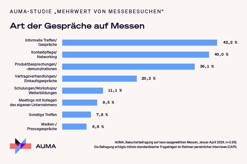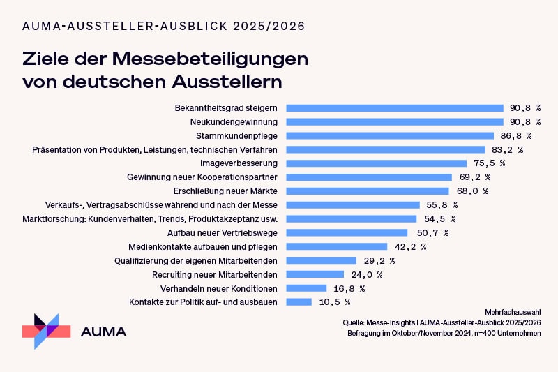 Die konsequente Ausrichtung auf die Bedürfnisse des Publikums macht Messebeteiligungen erst erfolgreich. Es zählen echte Mehrwerte: Lösungen anbieten, Dialog suchen, Vertrauen schaffen. Wo digitale Formate an ihre Grenzen stoßen, bauen persönliche Begegnungen auf Messen Brücken. Befragungen zeigen, dass diese Face-to-Face-Interaktionen nicht nur effizienter sind, sondern auch bei der Vertrauensbildung schneller und nachhaltiger funktionieren. Nachzulesen auch in der AUMA-Studie: Mehrwert von Messebesuchen.