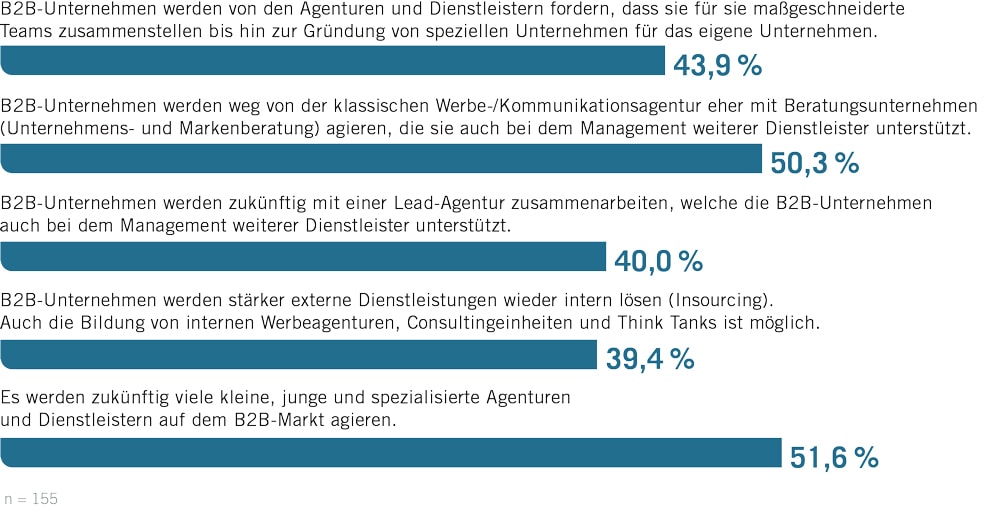 Die B2B-Unternehmen sehen für das eigene Unternehmen einen klaren Trend in Richtung junge und spezialisierte Agenturen sowie verstärktes Insourcing von Marketingaufgaben. Lead-Agenturen und Beratungsunternehmen werden aus Sicht der Unternehmen kaum eine Rolle spielen.