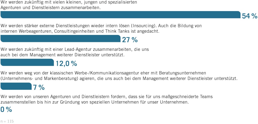 Bezüglich der zukünftigen Modelle zur Zusammenarbeit von Unternehmen und Agenturen besteht aus Sicht der Agenturen kein klares Ergebnis. Am stärksten erwarten die Agenturvertreter eine Verschiebung in Richtung Beratungsunternehmen sowie zu jungen und spezialisierten Agenturen.