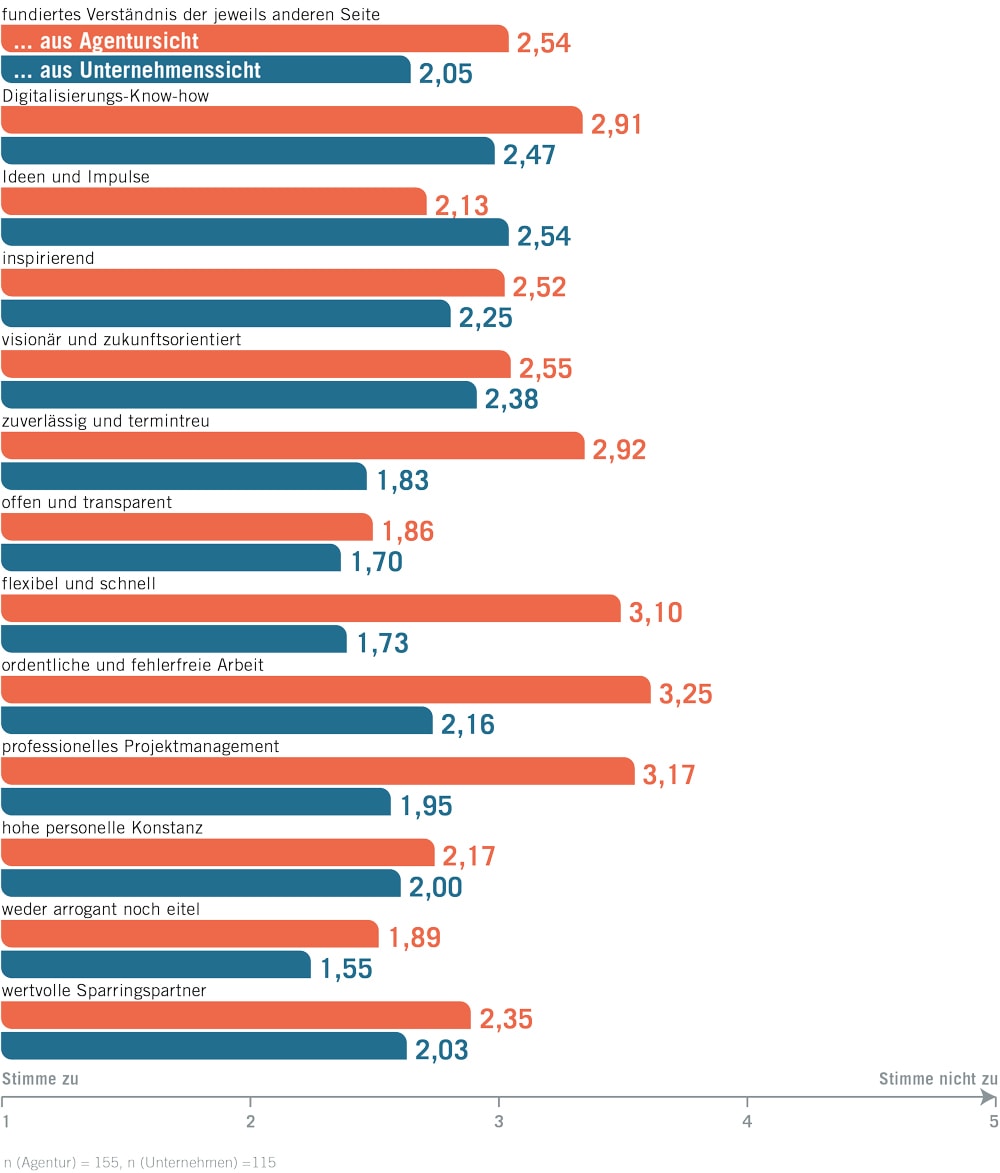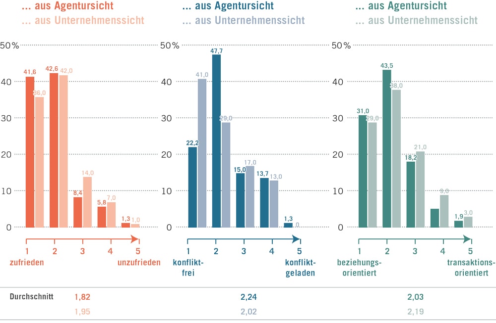 Insgesamt sind die Agenturvertreter zufrieden (1,82) mit der Beziehung zu Unternehmen.