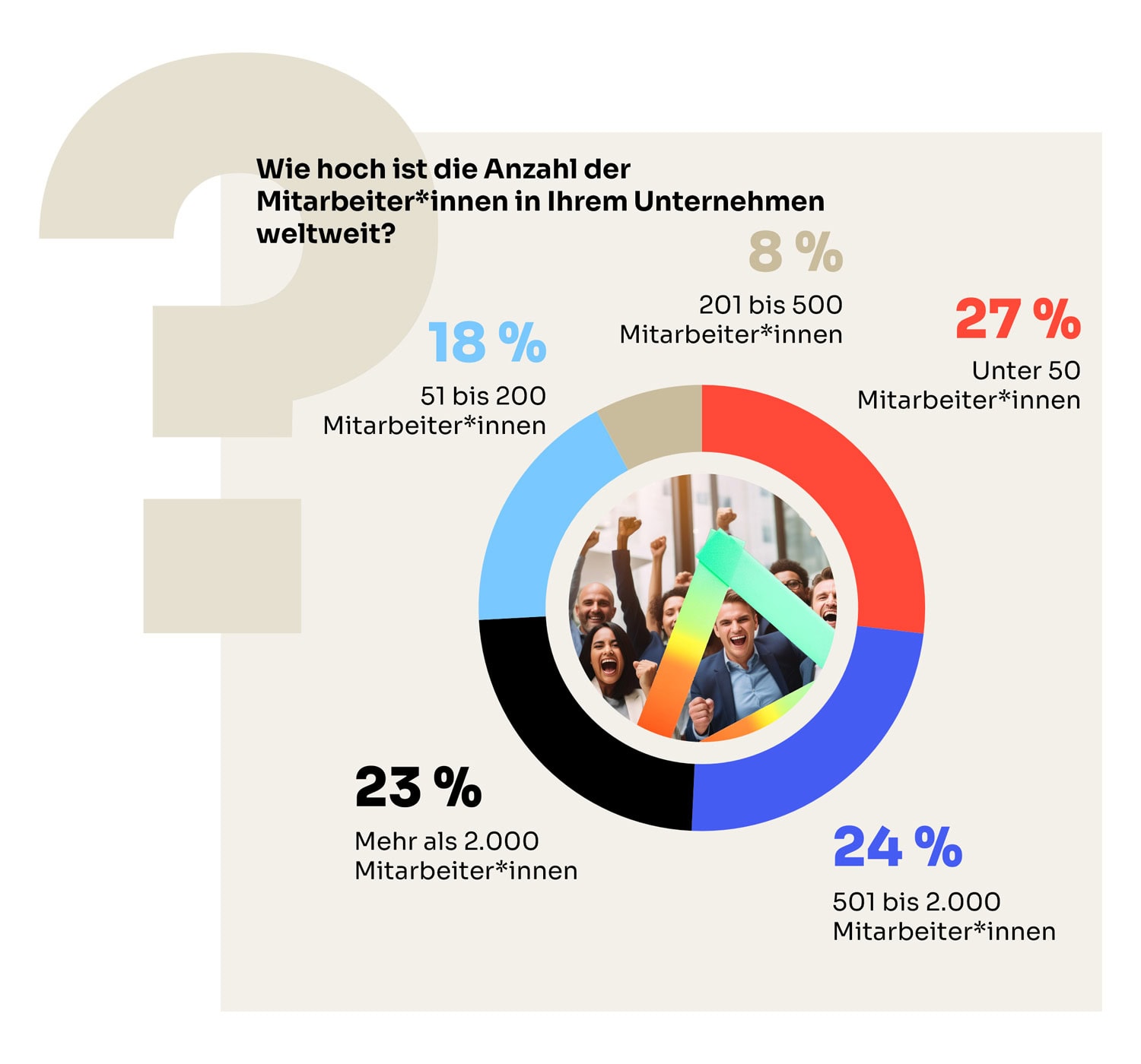 Hinsichtlich der Größe der Unternehmen sind Unternehmen mit bis zu 50 Mitarbeitenden und 501 bis 2.000 Mitarbeitenden die am stärksten vertretenen Gruppen (bis 50 MA = ca. 27 %, 501 bis 2.000 MA = 24 %). Dabei ist auffällig, dass ca. 80 % aller teilnehmenden Industrieunternehmen mehr als 500 Mitarbeitende haben und ca. 78 % aller teilnehmenden Dienstleistungsunternehmen bis zu 200 Mitarbeitende.