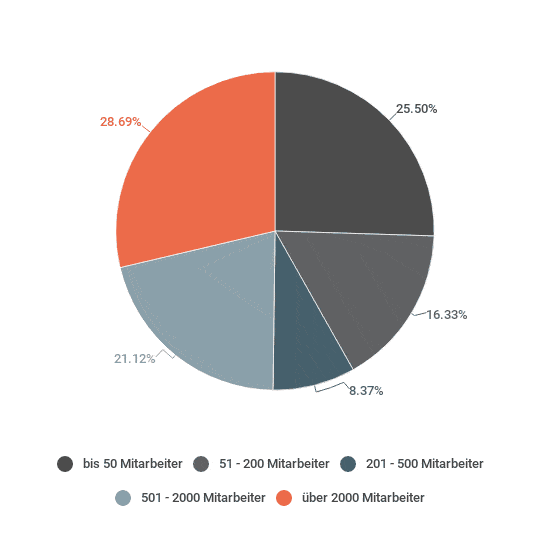 Hinsichtlich der Größe der Unternehmen sind Unternehmen bis zu 50 Mitarbeiter/innen und Unternehmen über 2000 Mitarbeiter/innen die am stärksten vertretenen Gruppen (>51 = ca. 26 % und >2000 = ca. 29 %). Dabei ist auffällig, dass ca. 80 % aller teilgenommenen Industrieunternehmen mehr als 500 Mitarbeiter/innen haben und ebenfalls ca. 80 % aller teilgenommen Dienstleistungsunternehmen bis zu 200 MA.