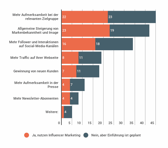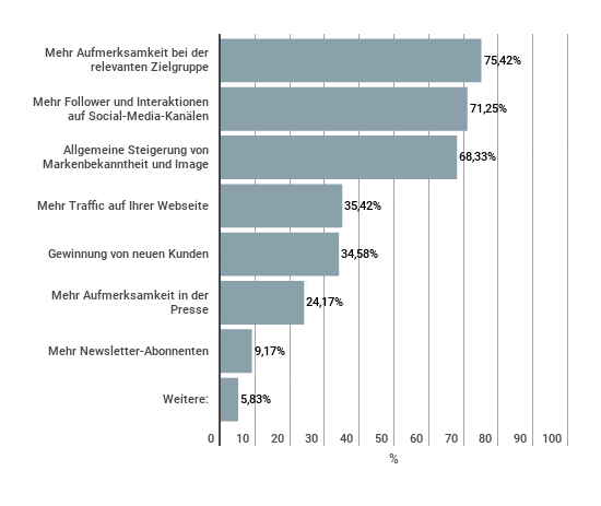 Mit deutlichem Abstand bzw. nur noch für einen kleineren Teil der Befragten scheint das Influencer Marketing auch für mehr Traffic auf der Website sowie für die Gewinnung von neuen Kunden geeignet zu sein. Und nur noch für einen sehr kleinen Teil der Befragten, wird es auch als sinnvoll für die Pressearbeit und die Gewinnung von beispielsweise mehr Newsletter-Abonnenten gesehen.