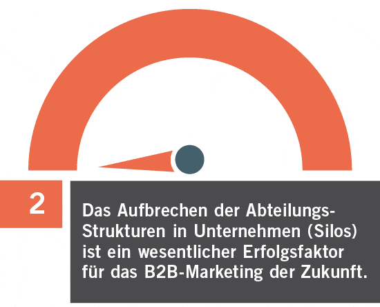 Unabhängig davon kann festgestellt werden, dass Veränderungen auf einer grundsätzlichen und strategischen Ebene inklusive den möglichen und erforderlichen Konsequenzen hinsichtlich der Strukturen und Prozesse als sehr wesentlich für das zukünftige B2B-Marketing gesehen werden. Damit ist aus Sicht der Befragten mit Blick auf strategische Entwicklungen das Aufbrechen des Silodenken die größte und vielleicht auch wichtigste Herausforderung für das B2B-Marketing der Zukunft.