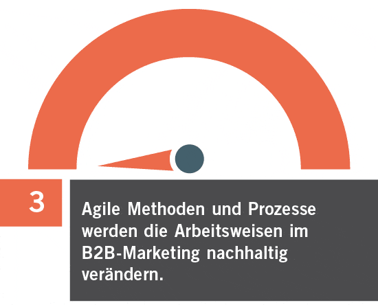 77 % der Befragten stimmen zu (stimmen weitgehend oder voll und ganz zu), dass agile Methoden und Prozesse die Arbeitsweisen im B2B-Marketing nachhaltig verändern werden. Diese Zustimmungswerte sind vergleichbar mit den ebenfalls sehr hohen Werten bezüglich des Aufbrechens des Silo-Denkens und machen damit die Arbeitsweisen im B2B-Marketing hier mit Blick auf agile Methoden und Prozesse zu einem weiteren TOP-Trend oder einer TOP-Herausforderung (Rang 3 von 10 und Median = 4 = Antwort: stimme weitgehend zu) im Kontext dieses Trendbarometers.