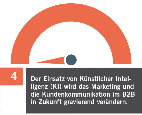 Ein starker Trend ist der Einsatz von Künstlicher Intelligenz (KI) im B2B-Marketing und in der B2B-Kommunikation. 70 % der Befragten stimmen der Aussage zu (stimme weitgehend oder voll und ganz zu), dass sich B2B-Marketing und -Kommunikation durch die KI zukünftig gravierend verändern werden. Im relativen Vergleich liegt dieser Trend auf Rang 4 von 10 (Median = 4 = Antwort: stimme weitgehend zu) und damit bereits im oberen Bereich der Trends und Herausforderungen.