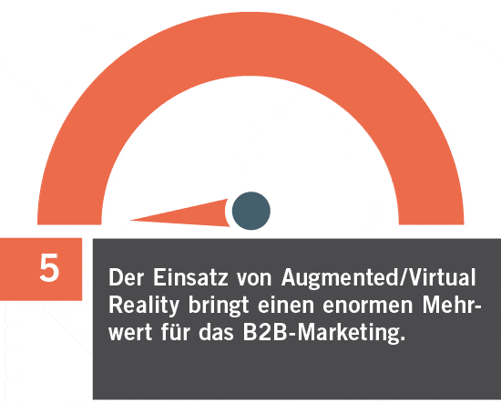 Im relativen Vergleich liegt das Thema Augmented / Virtual Reality für das B2B-Marketing auf Rang 5 von 10 (Median = 4 = Antwort: stimme weitgehend zu) und damit im relativen Mittelfeld der TOP-Trends und Herausforderungen im Rahmen dieser Umfrage.