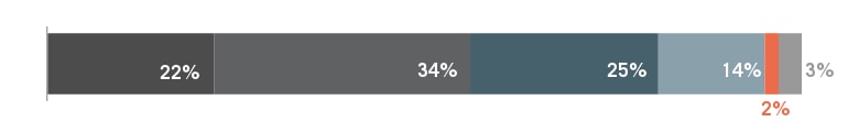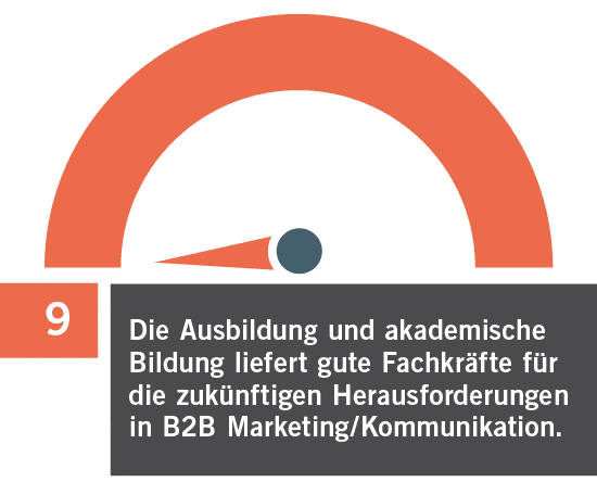 Die Befragten sehen die Qualität bzw. die Kompetenzen der Nachwuchskräfte über die Ausbildung oder akademischer Bildung zur Bewältigung der zukünftigen Herausforderungen im Bereich B2B-Marketing und -Kommunikation sehr gemischt. Ein Drittel der Befragten bestätigt, dass die (akademische) Ausbildung für B2B-Marketing und -Kommunikation gut ist, ein Drittel kann das eher nicht bestätigen und ein Drittel nur „teils/teils“ (Median = 3 = Antwort: teils/teils).