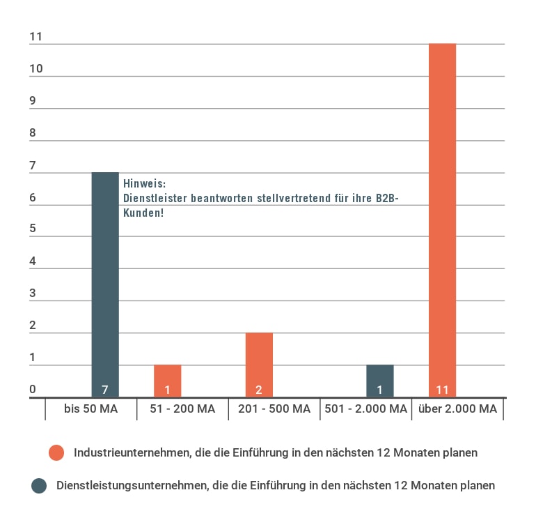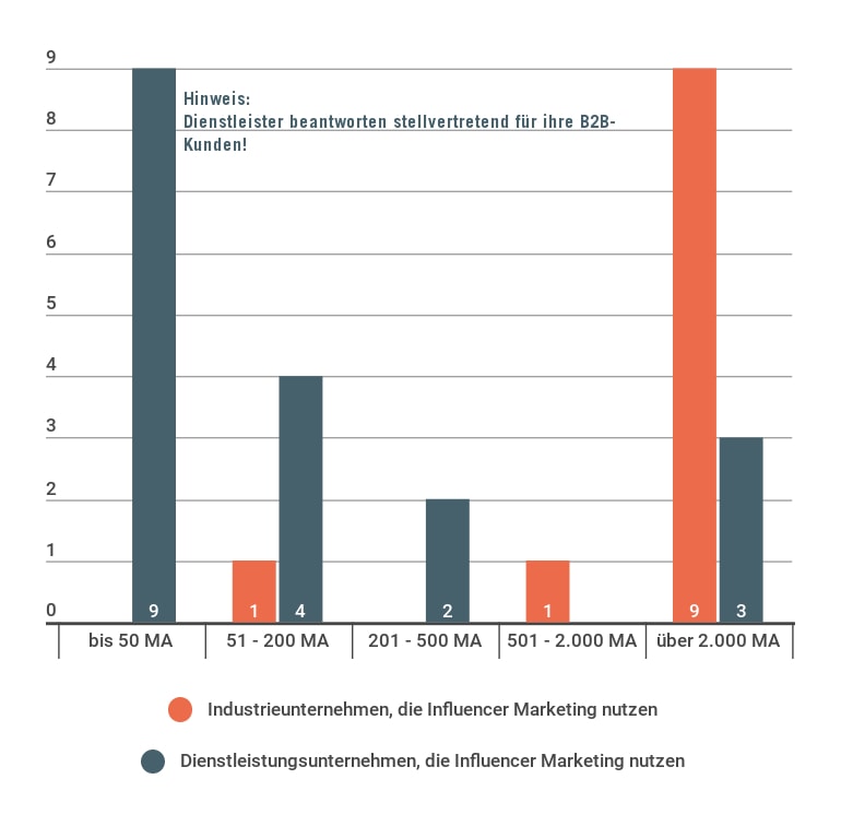 Bei etwas genauerer Betrachtung der im Moment und zukünftig aktiven Unternehmen im Bereich B2B-Influencer-Marketing fällt trotz geringer Fallzahl auf, dass insbesondere Industrieunternehmen mit über 2000 Mitarbeiter/innen und Dienstleistungsunternehmen mit bis zu 50 Mitarbeiter/innen Influencer Marketing nutzen oder demnächst planen.