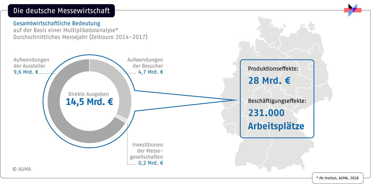 Messen lösen jährlich gesamtwirtschaftliche Produktionseffekte in Höhe von 28 Mrd. Euro aus. Insgesamt werden durch die Organisation von Messen 230.000 Arbeitsplätze gesichert. In den rund 58.000 messeaktiven Firmen im B2B-Segment gibt es mehr als 100.000 Vollzeitarbeitsplätze für die Organisation von Messen (siehe Infografik).