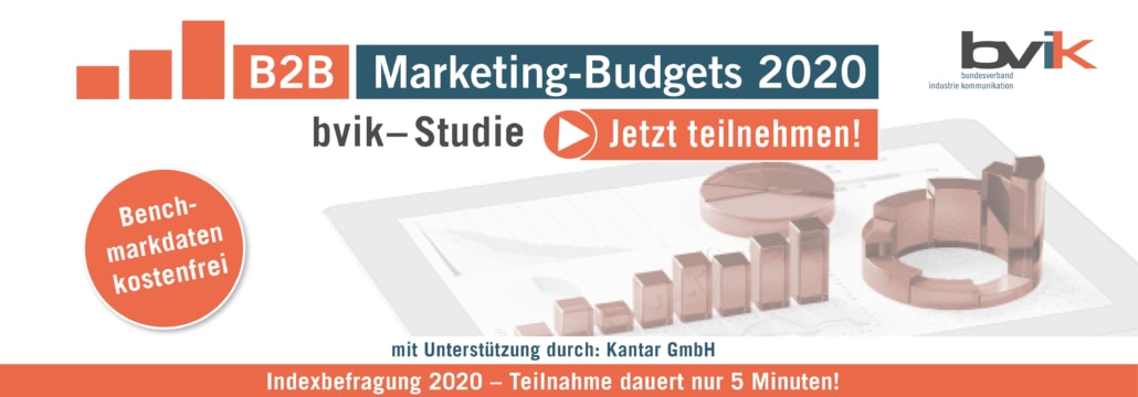 Aktuell untersucht der Bundesverband Industrie Kommunikation e.V. (bvik) in seiner Indexbefragung „B2B-Marketing-Budgets 2020“, wie hoch das Budget ist, das Marketing-Entscheidern aus Industrieunternehmen für ihre Maßnahmen zur Verfügung steht. Mit Unterstützung des Beratungs- und Marktforschungsunternehmens Kantar GmbH befragt der bvik bis Anfang Mai 2020 deutsche Industrieunterneh-men ab einer Größe von 50 Mitarbeitern mittels eines Onli-ne-Fragebogens. Die Teilnahme dauert nur 5 Minuten! Alle Teilnehmer erhalten die detaillierten Auswertungsergebnisse im Herbst 2020 kostenfrei. Weitere Informationen