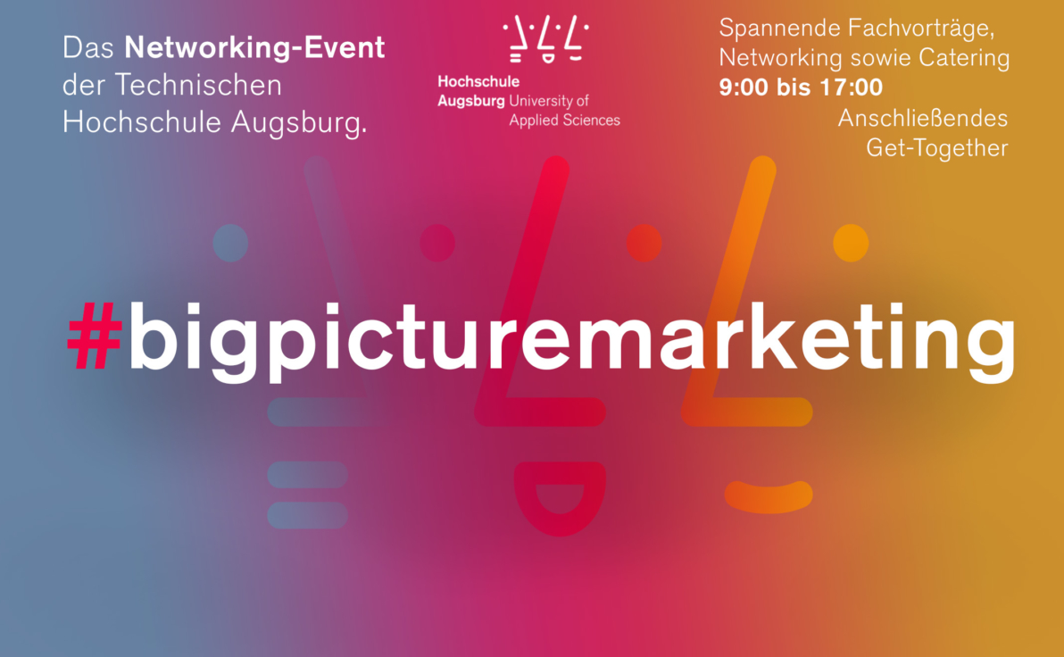 Dank einer progressiven und praxisnahen Sicht auf das Marketing seitens Professoren und Dozenten hat sich die Technische Hochschule Augsburg zu einem Inkubator für gefragte Persönlichkeiten im Bereich des Marketings entwickelt. Das Ziel von #bigpicturemarketing ist es, Talente zu fördern, sie mit Unternehmen zu verknüpfen und beide Parteien erfolgreich voranzutreiben. Außerdem können durch vielseitige Vorträge – sowohl von Studierenden, als auch von erfahrenen Speakern – lehrreiche Einblicke in das moderne Marketing gewonnen werden.